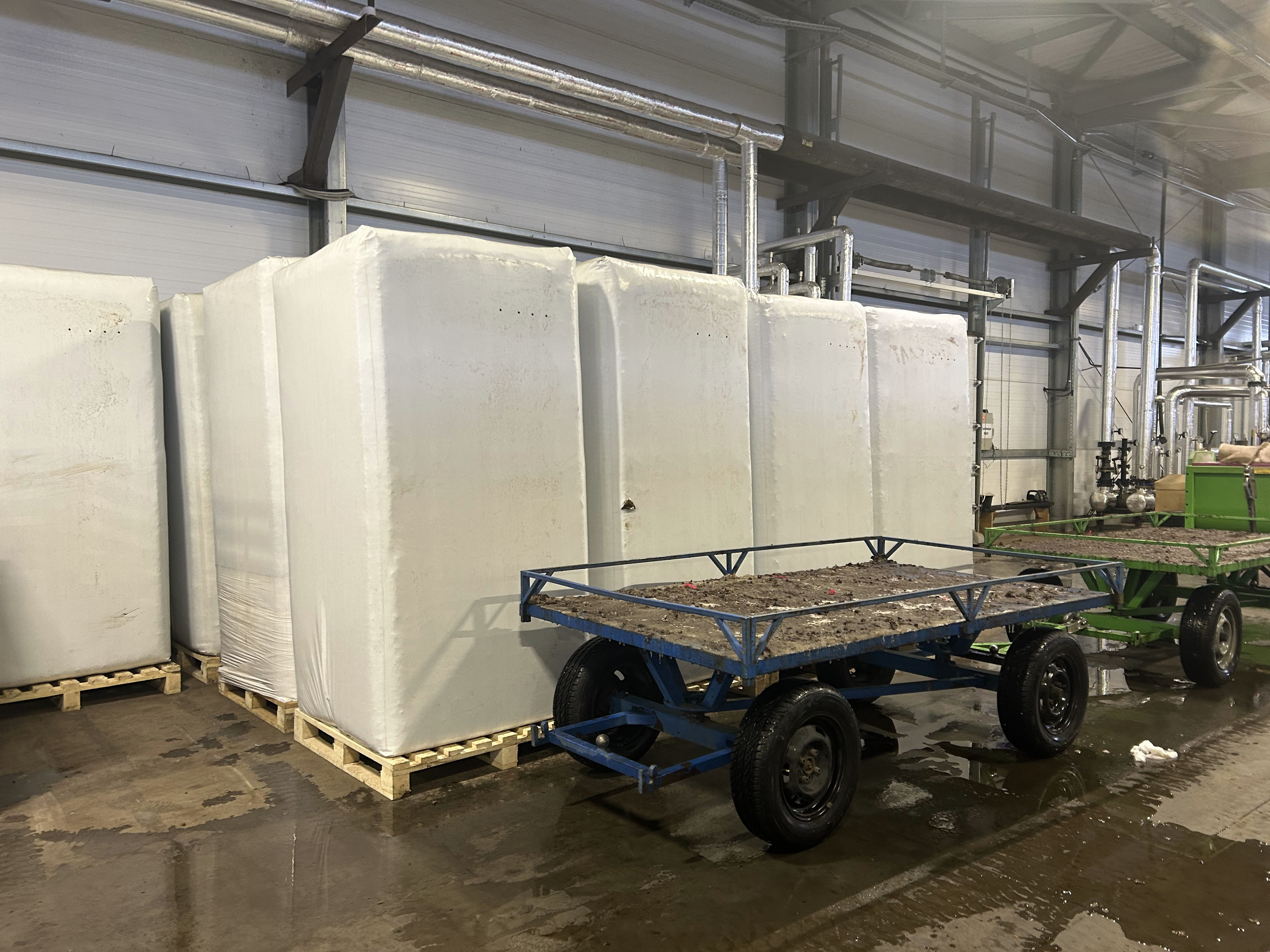 Цех заполнен запасами торфа, который для посадки в контейнеры нам помогает подготовить торфо-распушительная машина